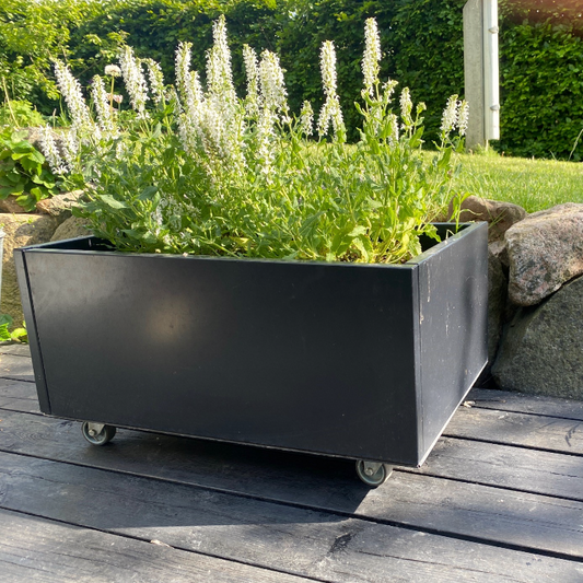GRÖNFELD planter and accessories made from powder coated aluminium in the colour dull black. This material is corrosion resistant and will last for many years. The unique method of double-folded edges in top and bottom secures stability in small as well as large elements. All standard models are available with bottom plates, wheels or legs and additional accessories. Made in Denmark.