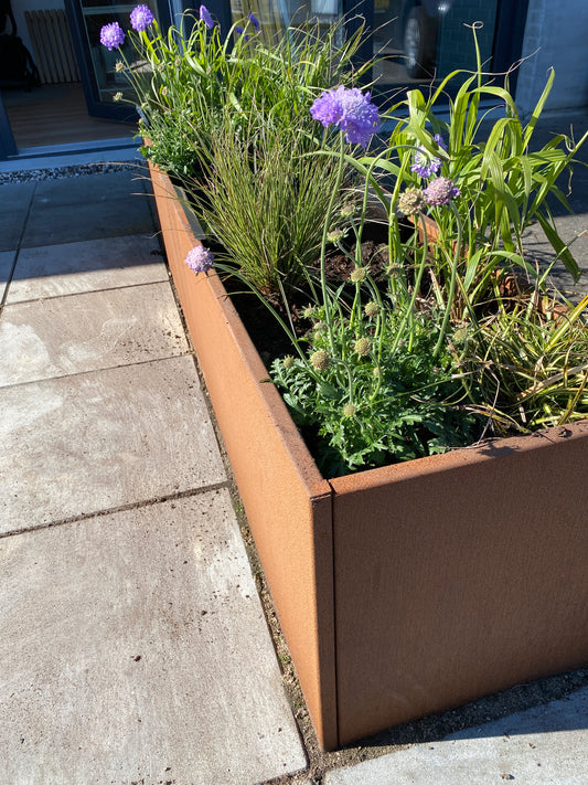 GRÖNFELD raised garden beds made from 2mm corten steel. Compared to raw iron corten steel is very corrosion resistant and has a lifespan of +20yrs. Over time the corten steel develops a beautiful rusty surface without tearing the material. The unique method of double-folded edges in top and bottom secures stability in small as well as large elements. DESIGNED AND MADE IN DENMARK.